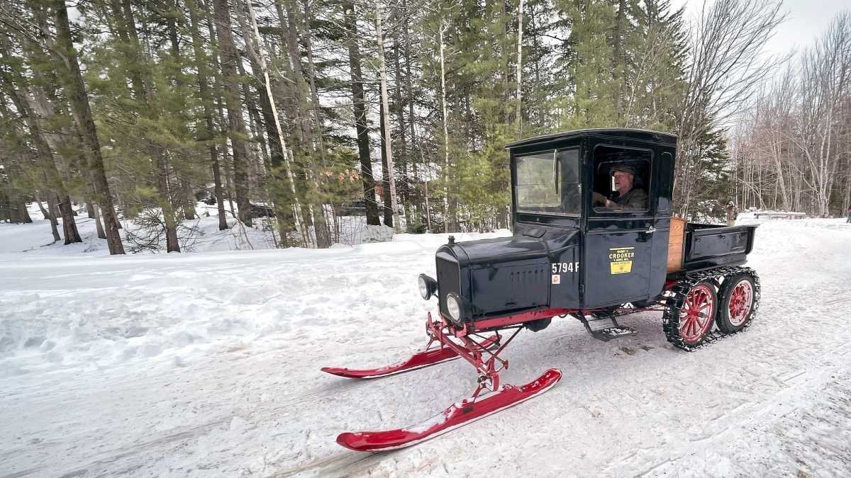This 1927 Ford Model TT is fitted with a Virgil White snowmobile conversion, patented in 1917. The conversion replaced the front wheels with skis and the rear wheels with a tracked drive unit, allowing the truck to travel over snow, ice, and frozen logging roads.